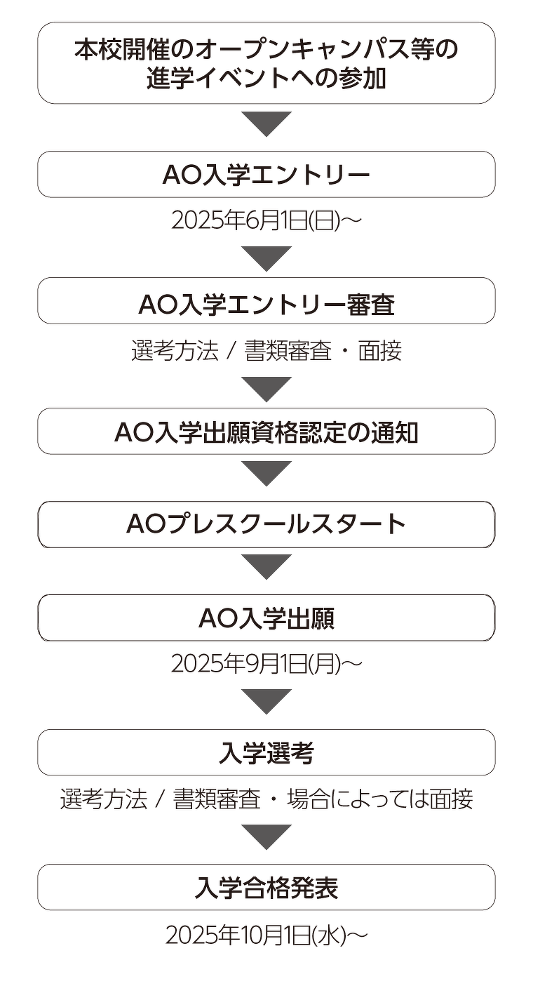 本校におけるAO入学制度とは、従来の書類審査だけでなく、オープンキャンパス等の進学イベントの参加と面接によって、本校が求める学生像(アドミッション・ポリシー)に準ずるかどうかを判断する入学制度です。
