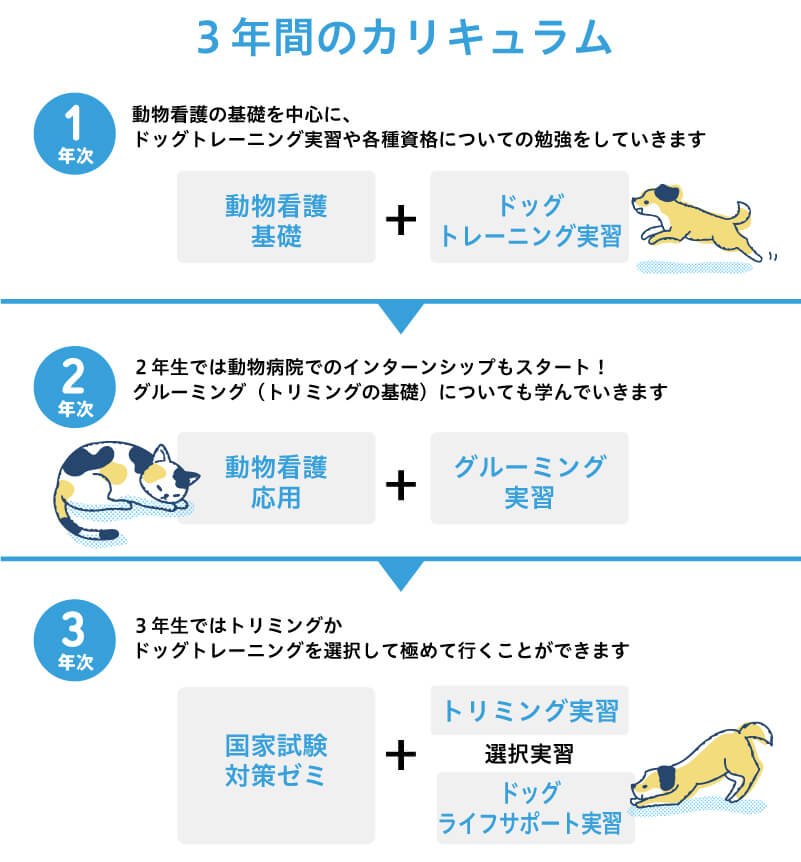 1・2年次で動物看護の基礎と実習をしっかり習得。3年次には「トリミング実習」または「ドッグライフサポート実習」を選択し、専門分野を深く学びます。 動物病院だけでなく、幅広い現場で活躍できる力を身につけます。