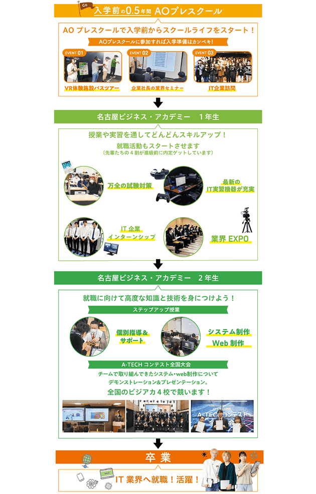 入学前の半年間、無料で特別授業を受けられるAO2.5教育サポートを実施。基礎を固めてからスタートできるため、就職にも強い。