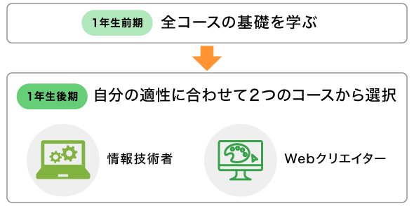 1年次前期で基礎を幅広く学び、後期から専門コースを選択。